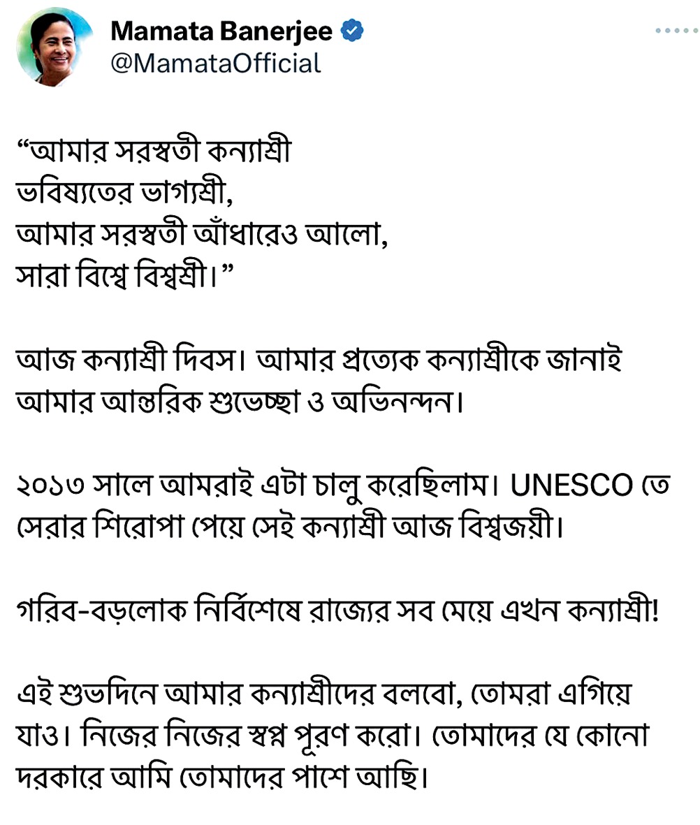 প্রতিবেদন : এক দশক পার করল মুখ্যমন্ত্রী মমতা বন্দ্যোপাধ্যায়ের স্বপ্নের প্রকল্প কন্যাশ্রী। বুধবার সকলেই আরও রাজ্যের মেয়েদের রক্ষার জন্য তাঁদের পাশে থাকার বার্তা দিলেন মুখ্যমন্ত্রী মমতা বন্দ্যোপাধ্যায়। ট্যুইট করে মুখ্যমন্ত্রী লেখেন, আমার সরস্বতী কন্যাশ্রী ভবিষ্যতের ভাগ্যশ্রী, আমার সরস্বতী আঁধারেও আলো, সারা বিশ্বে বিশ্বশ্রী। আজ কন্যাশ্রী দিবস। আমার প্রত্যেক কন্যাশ্রীকে জানাই আমার আন্তরিক শুভেচ্ছা ও অভিনন্দন। গরিব-বড়লোক নির্বিশেষে রাজ্যের সব মেয়ে এখন কন্যাশ্রী! তোমরা এগিয়ে যাও। নিজের নিজের স্বপ্ন পূরণ করো। তোমাদের যে কোনও দরকারে আমি তোমাদের পাশে আছি। ইউনেস্কোতে সেরার শিরোপা পেয়ে সেই কন্যাশ্রী আজ বিশ্বজয়ী।