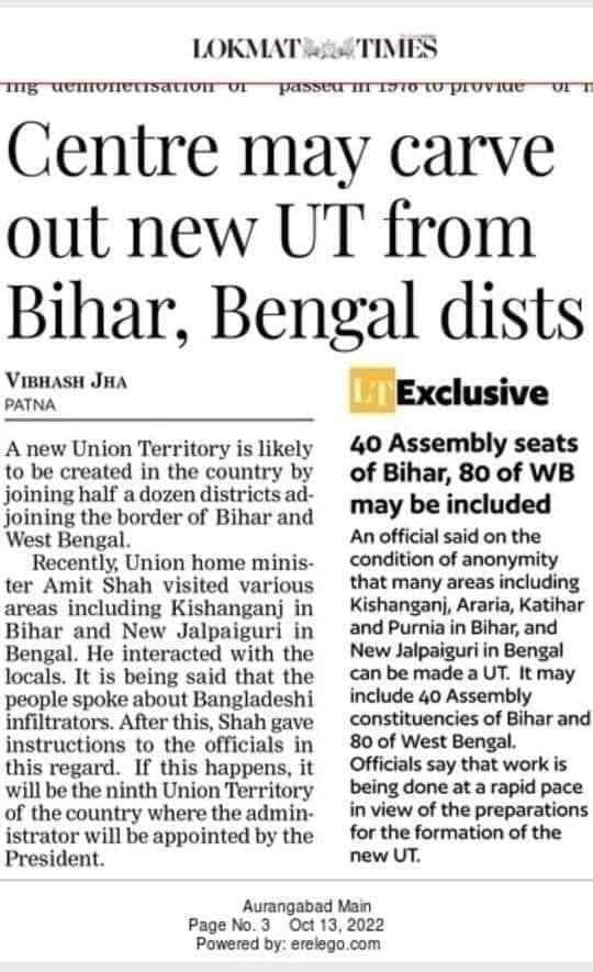 সংবাদপত্রের সংবাদ অনুযায়ী দেখা যাচ্ছে বাংলা এবং বিহার বিজেপির নিয়ন্ত্রণে নিয়ে আসতে না পারায় তার দিকেই লক্ষ্য। বাংলা (Break Bengal) এবং বিহারের বেশ কিছু জেলা ভেঙে নতুন কেন্দ্রশাসিত অঞ্চল করার চক্রান্ত শুরু হয়েছে। স্বরাষ্ট্রমন্ত্রকের এক শীর্ষ পদস্থ কর্তা জানাচ্ছেন, বিহারের কিসানগঞ্জ, আরারিয়া, কাটিহার, পূর্ণিয়া অন্যদিকে বাংলার নিউ জলপাইগুড়ি ও সংলগ্ন কয়েকটি জেলা নিয়ে কেন্দ্রশাসিত অঞ্চল করার ভাবনা শুরু হয়েছে। এই কেন্দ্রশাসিত অঞ্চলে বিহারের ৪০টি এবং পশ্চিমবঙ্গের ৮০টি বিধানসভা আসন থাকছে। উদ্বেগ আরও বাড়িয়ে সেই শীর্ষ পদস্থ কর্তা বলেছেন, দ্রুতগতিতে কাজ চলছে এই কেন্দ্রশাসিত অঞ্চল তৈরি করতে। সম্প্রতী কেন্দ্রীয় স্বরাষ্ট্রমন্ত্রী বিহারের কিষানগঞ্জ এবং বাংলার নিউ জলপাইগুড়ি ঘুরে গিয়েছেন। বিজেপির তরফে দাবি করা হচ্ছে, এ সব জায়গায় নাকি শুধু অনুপ্রবেশকারীরা রয়েছে। এই সব শোনার পরেই অমিত শাহর নির্দেশ, কেন্দ্রশাসিত অঞ্চল তৈরির। প্রশ্ন হচ্ছে, অনুপ্রবেশকারীরা যদি ভারতে ঢোকে তাহলে দায়িত্ব কার? বিএসএফ সীমান্তে বসে কোন কাজ করছে? অমিত শাহর স্বরাষ্ট্র দফতর দেশের সর্বকালের অপদার্থ দফতর। তৃণমূল কংগ্রেস যথার্থ বলেছে, বাংলার মানুষ বুঝিয়ে দেবেন এমন সিদ্ধান্ত বাস্তবায়িত হলে। বাংলা ভাগ করার চক্রান্ত রুখে দেবেন বাংলার মানুষ।