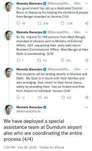 মুখ্যমন্ত্রী মমতা বন্দ্যোপাধ্যায় (Mamata Banerjee) শনিবার সন্ধ্যায় টুইট করে জানিয়েছেন, এ পর্যন্ত ইউক্রেনে আটকে পড়া এরাজ্যের ১৯৯ জন বাসিন্দার তথ্য বিদেশ মন্ত্রক দেওয়া হয়েছে।তাঁদের যাতে দ্রুত এবং নিরাপদে ফিরিয়ে আনা হয় সে সম্পর্কে অনুরোধ জানানো হয়েছে রাজ্যের তরফে। রাজ্যের রেসিডেন্ট কমিশনারের তরফে বিদেশ মন্ত্রকের সঙ্গে নিয়মিত যোগাযোগ রাখা হচ্ছে। মুখ্যমন্ত্রী আরও জানান সেদিন রাতেই রাজ্যের কয়েকজন পড়ুয়া দিল্লি এবং মুম্বাইতে পৌঁছাবেন। রাজ্য সরকার তাদের বিমানের টিকিট সহ বাড়ি ফেরানোর সমস্ত খরচ বহন করছে। আটকে পড়ুয়াদের পরিবারের সঙ্গেও রাজ্য সরকারের তরফে নিয়মিত যোগাযোগ রাখা হচ্ছে। পড়ুয়াদের বাড়ি ফিরতে সহায়তা করার জন্য দমদম বিমানবন্দরে বিশেষ সাহায্যকারী দল মোতায়েন করা হয়েছে বলেও মুখ্যমন্ত্রী মমতা বন্দ্যোপাধ্যায় (Mamata Banerjee) জানিয়েছেন।