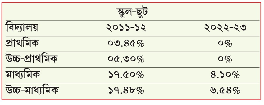 ড্রপ আউট বা বিদ্যালয়-ছুটের হার সংক্রান্ত নিচের পরিসংখ্যানটি দেখলেই বোঝা যাবে, বিদ্যালয় শিক্ষাব্যবস্থায় ছাত্রীদের ধরে রাখা গেছে। নিছক আর্থিক কারণে লেখাপড়া ছেডে় দেওয়ার ঘটনা ২০১১ থেকে গত ১২ বছরে অনেকটাই কমেছে, প্রাথমিক ও উচ্চ-প্রাথমিকস্তরে তা শূন্যে নেমে এসেছে।