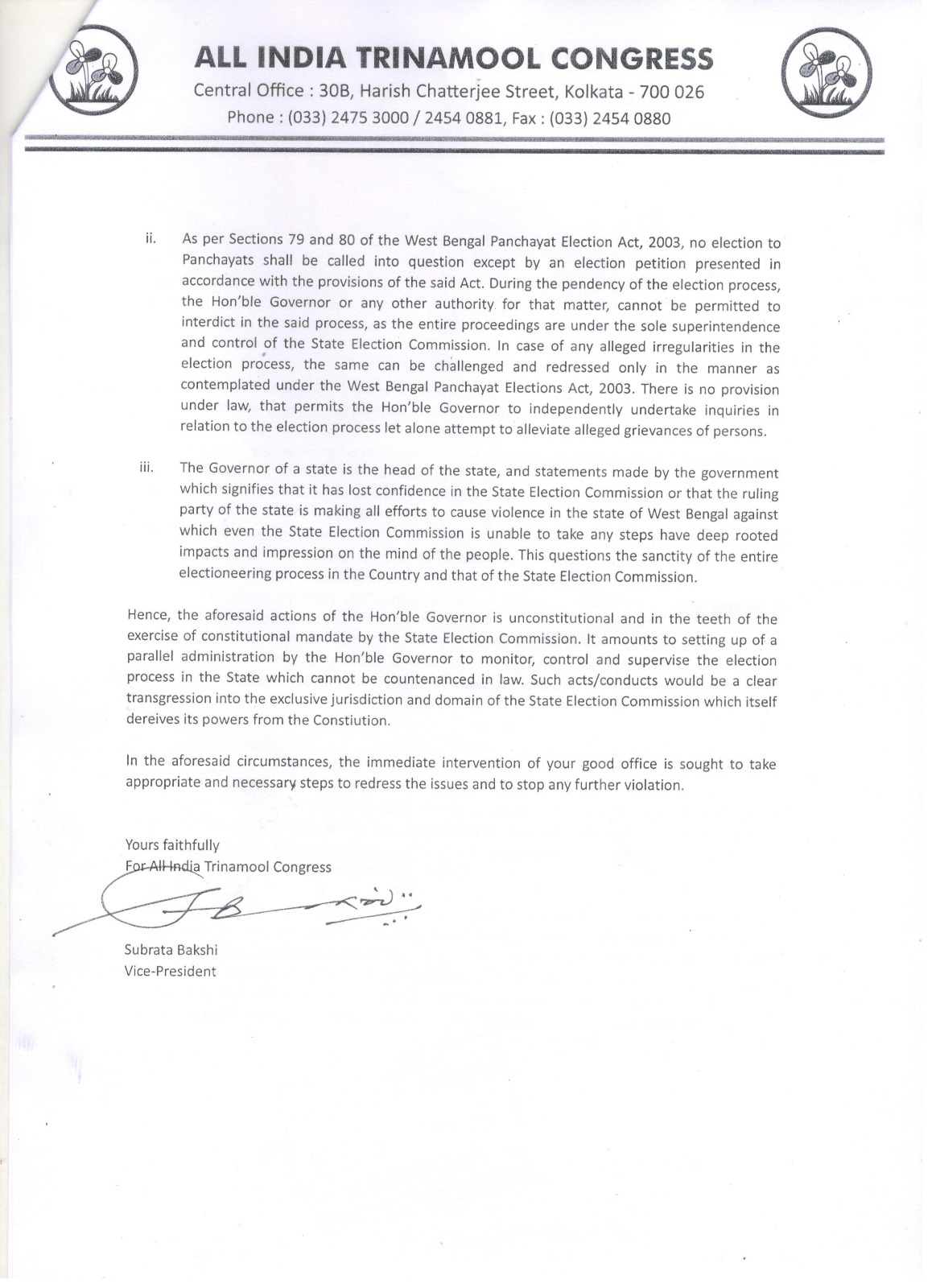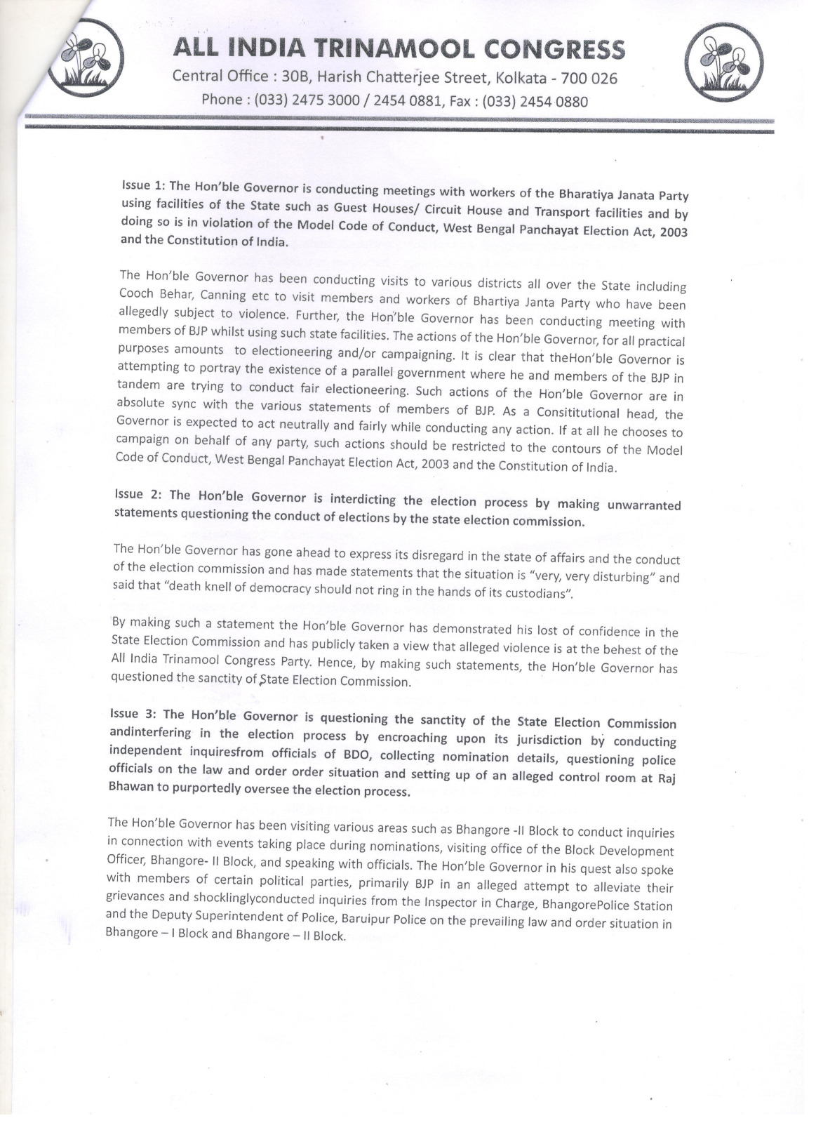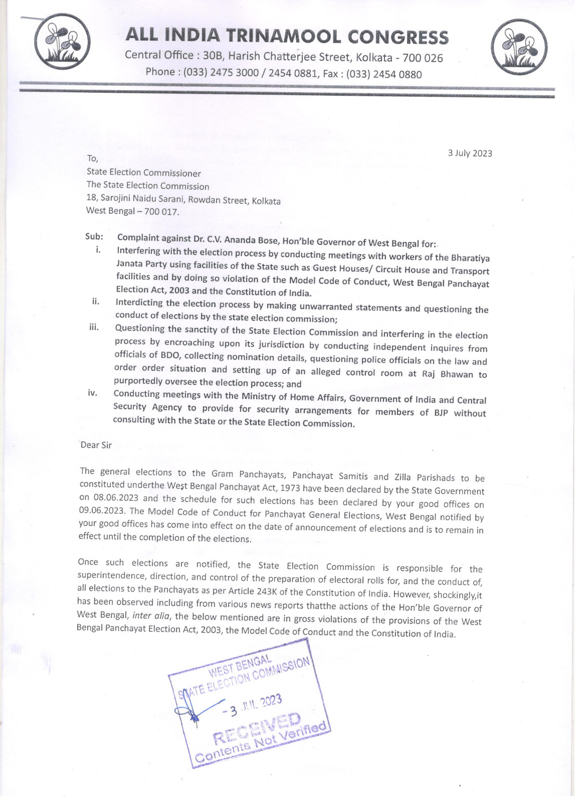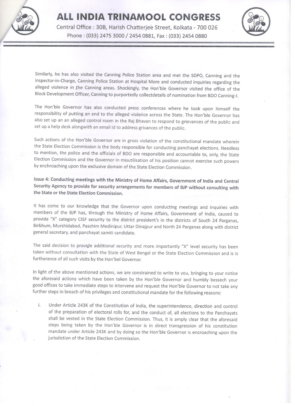 রাজ্য নির্বাচন কমিশনের ভূমিকা নিয়ে প্রশ্ন তোলাও প্রত্যাশিত নয় বলে মনে করছে তৃণমূল কংগ্রেস। রাজ ভবনে ইতিমধ্যেই খোলা হয়েছে একটি কন্ট্রোল রুম, যেখানে সাধারণ মানুষ অভিযোগ জানাতে পারবেন। এই কন্ট্রোল রুম নিয়ে চিঠিতে অসন্তোষ জানিয়েছে তৃণমূল। সেখানে অভিযোগ করা হয়, রাজ্যপাল নির্বাচন কমিশনের কাজে হস্তক্ষেপ করছেন। তিনি যে নিয়মে বিডিওদের থেকে রিপোর্ট সংগ্রহ করছেন, পুলিশের সঙ্গে কথা বলে তথ্য সংগ্রহ করছেন, সেটা ঠিক নয় বলে মনে করা হচ্ছে। এছাড়া সরকারি ভবনে বিজেপি নেতাদের সঙ্গে বৈঠক করছেন রাজ্যপাল, সেটা নির্বাচনী বিধি ভঙ্গ বলে মনে করছে তৃণমূল কংগ্রেস। সার্কিট হাউস বা গেস্ট হাউসে গেরুয়া শিবিরের নেতাদের সঙ্গে বৈঠক করা হয়েছে বলে সেখানে অভিযোগ করা হয়েছে।