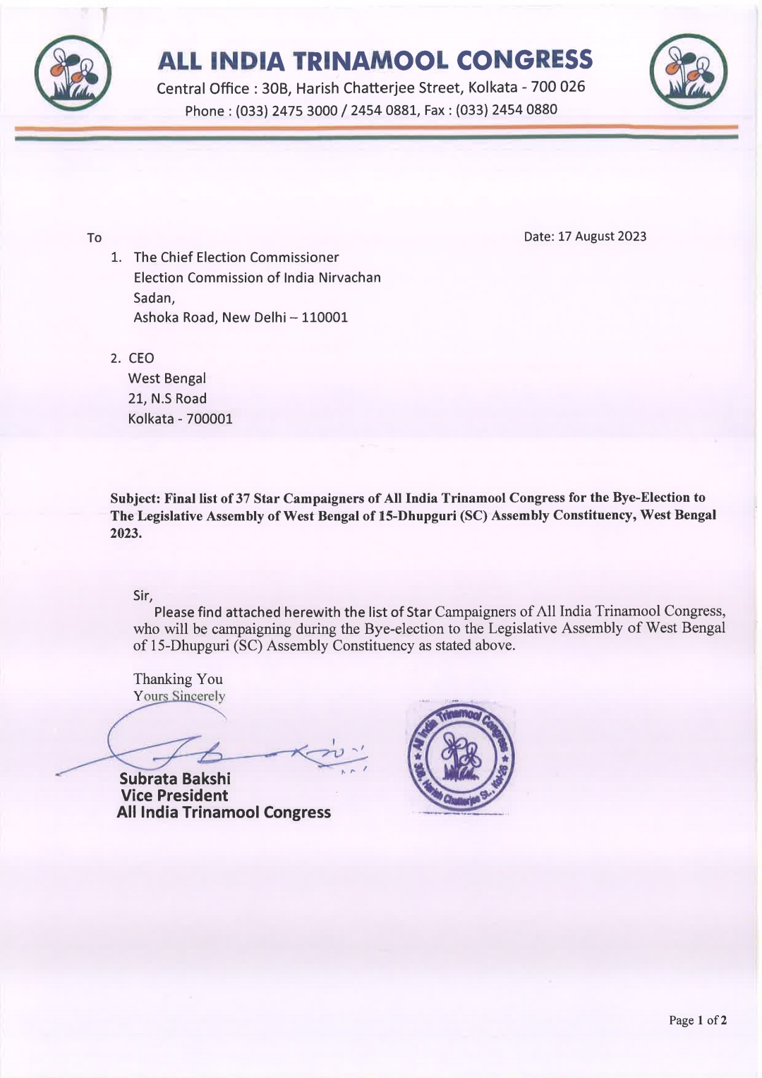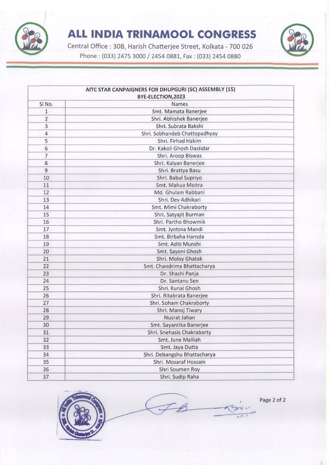 এছাড়াও তালিকায় থাকা আরও ৩৫ জন তারকা প্রচারকরা হলেন, দলের সভাপতি সুব্রত বক্সি, শোভনদেব চট্টোপাধ্যায়, ফিরহাদ হাকিম, কাকলি ঘোষ দস্তিদার, অরূপ বিশ্বাস, কল্যাণ বন্দ্যোপাধ্যায়, ব্রাত্য বসু, বাবুল সুপ্রিয়, মহুয়া মৈত্র, গুলাম রব্বানি, দেব অধিকারী, মিমি চক্রবর্তী, সত্যজিৎ বর্মন, পার্থ ভৌমিক, জ্যোৎস্না মান্ডি, বিরবাহা হাঁসদা, অদিতি মুন্সি, সায়নী ঘোষ, মলয় ঘটক, চন্দ্রিমা ভট্টাচার্য, শশী পাঁজা, শান্তনু সেন, কুণাল ঘোষ, ঋতব্রত বন্দ্যোপাধ্যায়, সোহম চক্রবর্তী, মনোজ তিওয়ারি, নুসরত জাহান, সায়ন্তিকা বন্দ্যোপাধ্যায়, স্নেহাশিস চক্রবর্তী, জুন মালিয়া, জয়া দত্ত, দেবাংশু ভট্টাচার্য, মোশারফ হোসেন, সৌমেন রায় এবং সুদীপ রাহা।