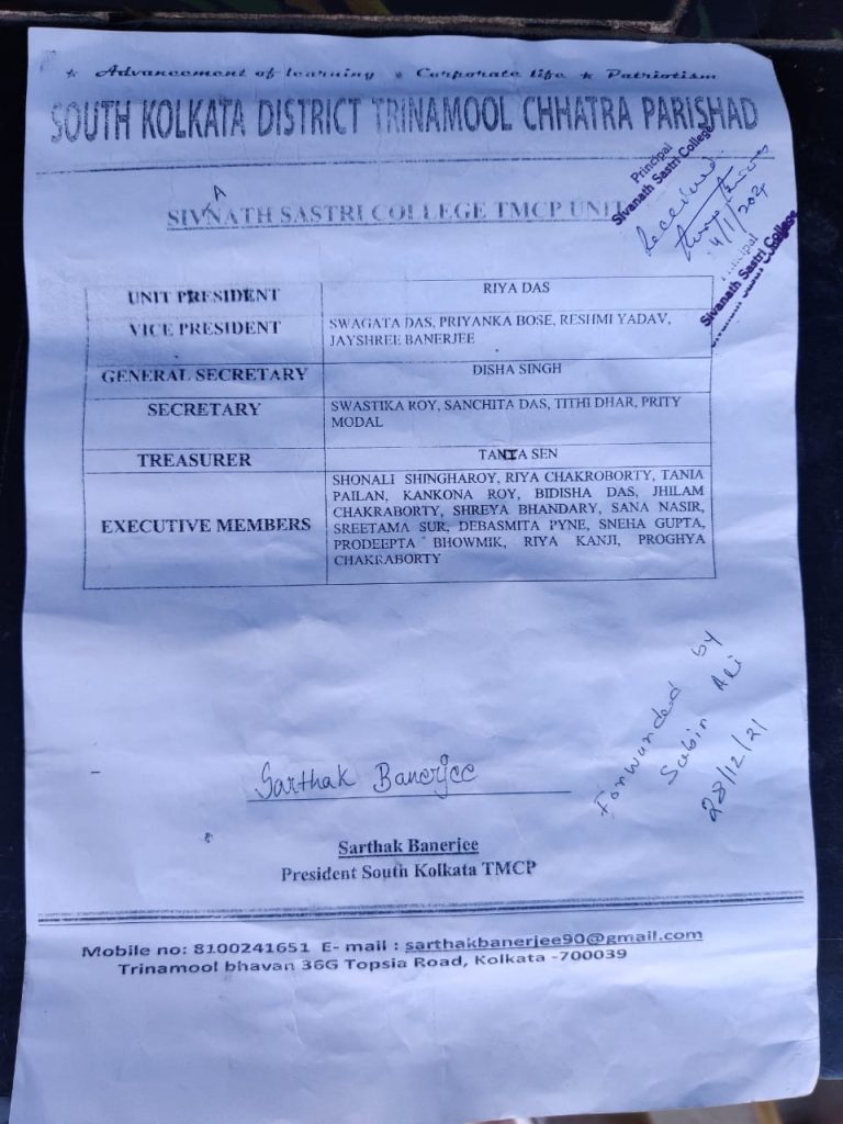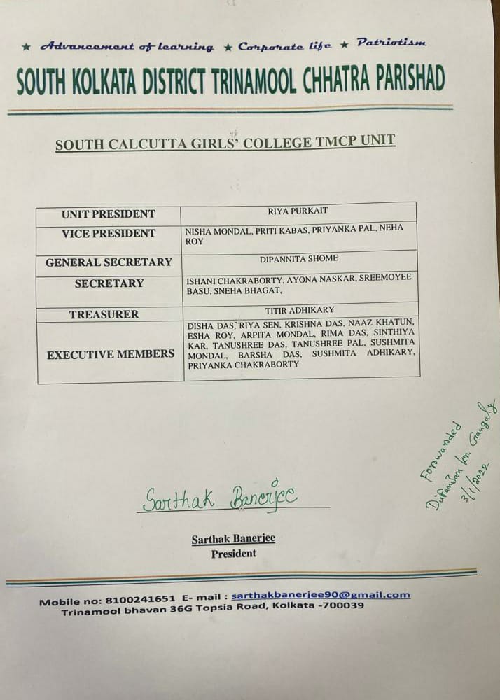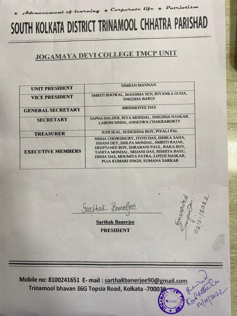 কলকাতার আরও তিনটি কলেজে ইউনিট করল তৃণমূল কংগ্রেস ছাত্র পরিষদ (TMCP)। দীর্ঘদিন ধরে এই কলেজগুলির পড়ুয়াদের ইউনিট খোলার জন্য আবেদন ছিল তৃণমূল কংগ্রেস ছাত্র পরিষদ নেতৃত্বের কাছে। সেইমতো গত পয়লা জানুয়ারি, তৃণমূলের (TMC) প্রতিষ্ঠা দিবসের দিন যোগমায়াদেবী, শিবনাথ শাস্ত্রী এবং সাউথ ক্যালকাটা গার্লস কলেজ ইউনিট খোলে তৃণমূল ছাত্র পরিষদ (TMCP)। এই তিনটি কলেজে দক্ষিণ কলকাতার। এবং প্রতিটি কলেজ-ই গার্লস।