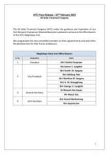 মেঘালয়ে ১১ জনের রাজ্য কমিটি ঘোষণা করল তৃণমূল কংগ্রেস। দলনেত্রী মমতা বন্দ্যোপাধ্যায়ের অনুমোদন সাপেক্ষে মেঘালয় রাজ্য তৃণমূল কংগ্রেসের (Trinamool Congress) সভাপতি করা হয়েছে চার্লস পিনগ্রোপেকে। সহ সভাপতি হয়েছেন৬ জন। সাধারণ সম্পাদক হয়েছে দুজনকে এবং যুগ্ম সম্পাদক রয়েছেন দুজন।