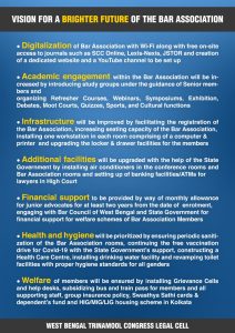 ইনফ্রাস্ট্রাকচার হাইকোর্টের বার অ্যাসোসিয়েশনের আধুনিকীকরণে জোর দেওয়া হবে। বার অ্যাসোসিয়েশনের খোলনলচে বদলে দেওয়ার প্রতিশ্রুতি দেওয়া হয় তৃণমূল সেলের পক্ষ থেকে। আরও বেশি বেশি কম্পিউটার, প্রিন্টার, ড্রয়ার থেকে শুরু করে বসার জন্য আধুনিক ব্যবস্থা। সবমিলিয় একটা সুন্দর কাজের পরিবেশ তৈরি করা হবে বার অ্যাসোসিয়েশনকে কেন্দ্র করে।
