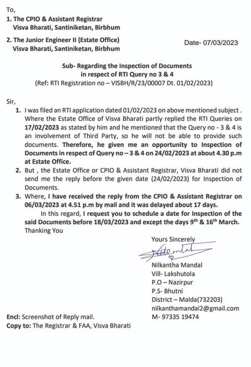 পাশাপাশি, তথ্য বা প্রামাণ্য চাক্ষুষ করতে আবেদনকারীকে আসতে বলা হয়। কিন্তু যে তারিখে হাজির হওয়ার কথা বলা হয়, সেই তারিখ পার হয়ে আবেদনকারীর কাছে চিঠি আসে। এর পর ইমেল মারফত বিষয়টি কর্তৃপক্ষকে জানালে চলতি বছরের ১০ মার্চ হাজিরার তারিখ দেওয়া হয়। নীলকণ্ঠ বলেন, এস্টেট অফিসে গিয়ে লিজ দলিলের অথেনটিকেটেড কপি দেখতে চাইলে ওঁরা জেরক্স কপি দেখান, তার ৫ নম্বর পাতায় নিচের দিকে জমির পরিমাণ ১.২৫ একর লেখা হলেও উপরের অংশ ও নিচের অংশের টাইপিং-এ দু’রকম লেখা আমার চোখে পড়ে।