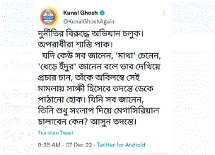 প্রতিবেদন : শিক্ষক নিয়োগ সংক্রান্ত মামলার শুনানিতে বারবার রাজ্যের শাসক দল তৃণমূল কংগ্রেসকে নিশানা করেছেন কলকাতা হাইকোর্টের বিচারপতি অভিজিৎ গঙ্গোপাধ্যায়। এবার নাম না করে বিচারপতিকে বিঁধলেন তৃণমূল কংগ্রেসের রাজ্যের সাধারণ সম্পাদক কুণাল ঘোষ (TMC-Kunal Ghosh)। ওই মামলার পর্যবেক্ষণে বিচারপতি গঙ্গোপাধ্যায় কখনও বলেন ‘ধেঁড়ে ইঁদুররা সামনে আসবে’, কখনও বলেন, ‘দালাল মুখপাত্র’, কখনও আবার বলেছেন, ‘ঢাকি সহ বিসর্জন দিয়ে দেব’। এই আবহে বুধবার সকালে একটি ট্যুইট করেন কুণাল ঘোষ। টুইটারে তিনি লেখেন, ‘দুর্নীতির বিরুদ্ধে অভিযান চলুক, অপরাধীরা শাস্তি পাক’। এরপরই তিনি লিখেছেন, ‘‘যদি কেউ সব জানেন, ‘মাথা’ চেনেন, ‘ধেড়ে ইঁদুর’ জানেন বলে ভাব দেখিয়ে প্রচার চান, তাঁকে অবিলম্বে সেই মামলায় সাক্ষী হিসেবে তদন্তে ডেকে পাঠানো হোক। যিনি সব জানেন, তিনি শুধু সংলাপ দিয়ে মেগাসিরিয়াল চালাবেন কেন? আসুন তদন্তে।” যদিও ট্যুইটের কোথাও কারও নাম করেননি কুণাল। তবে মনে করা হচ্ছে, এই কথাগুলি যিনি বলেছিলেন তাঁকেই নিশানা করেছেন তৃণমূল মুখপাত্র (TMC-Kunal Ghosh)। এর আগে দলের তরফে সাংবাদিক বৈঠকে কুণাল বলেন, বিচার ব্যবস্থার প্রতি আমরা শ্রদ্ধাশীল। কিন্তু কেউ যদি তাঁর ব্যক্তিগত ইচ্ছে তথা উইশ লিস্ট পর্যবেক্ষণের মাধ্যমে সংবাদমাধ্যমকে জানিয়ে প্রচার পেতে চান, তা হলে তা অত্যন্ত দুর্ভাগ্যজনক। এরই মধ্যে বুধবার ফের সরকারি কর্মচারীদের হুঁশিয়ারি দিলেন বিচারপতি অভিজিৎ গঙ্গোপাধ্যায়। এদিন তিনি কর্মচারীদের ‘বাবুগিরি’ দেখানো নিয়ে বলেন, টেবিলে বসে ‘বাবুগিরি’ দেখানো সরকারি কর্মচারীরা বেতন বৃদ্ধি-সহ নানা সুযোগ-সুবিধা কেন পাবেন? এই প্রশ্ন তুলে বিচারপতি অভিজিৎ গঙ্গোপাধ্যায় গোটা বিষয়টি ভিজিল্যান্স কমিশনারকে খতিয়ে দেখার নির্দেশ দেন। আগামী ১৫ দিনের মধ্যে আদালতে এই রিপোর্ট জমা দেওয়ার নির্দেশ দিয়েছেন তিনি।