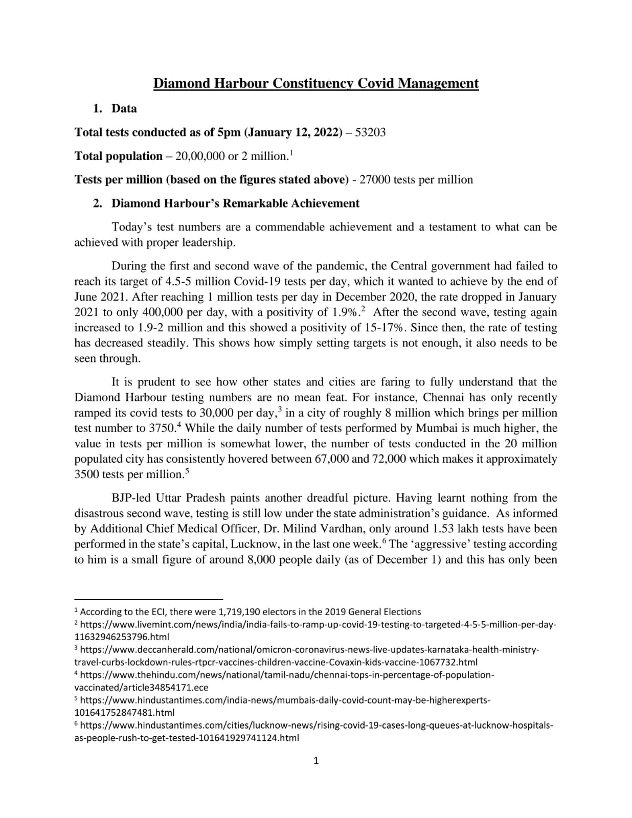 শুধু তাই নয় গোটা দেশের সামগ্রিক ছবিটার দিকে যদি নজর রাখা যায় তাহলে দেখা যাবে, করোনার প্রথম ও দ্বিতীয় ঢেউয়ে সরকার রীতিমতো ব্যর্থ হয়েছে সারাদেশে দৈনিক ৪.৫ থেকে ৫ মিলিয়ন করোনা টেস্টের লক্ষ্য পূরণে। সরকার এই লক্ষ্যমাত্রা নিয়েছিল ২০২১ সালের জুন পর্যন্ত। ২০২০ সালের ডিসেম্বর মাসে সরকার দৈনিক ১ মিলিয়ন করোনা টেস্টের লক্ষ্যমাত্রায় পৌঁছালেও ২০২১ এর জানুয়ারি মাসে তা নেমে আসে মাত্র ৪ লক্ষে। একইসঙ্গে পজিটিভিটি ১.৯ শতাংশ। করোনার (Coronavirus) দ্বিতীয় ঢেউয়ে টেস্টের হার বেড়ে হয় ১.৯ থেকে ২ মিলিয়ন, পজিটিভিটি ছিল ১৫-১৭ শতাংশ। এই সমস্ত রিপোর্টের সঙ্গে তুলনামূলকভাবে করোনা মোকাবিলায় ডায়মন্ড হারবারের পদক্ষেপ এবং ‘অভিষেক মডেল’ গোটা দেশের মডেল হয়ে ওঠার জন্য উপযুক্ত।