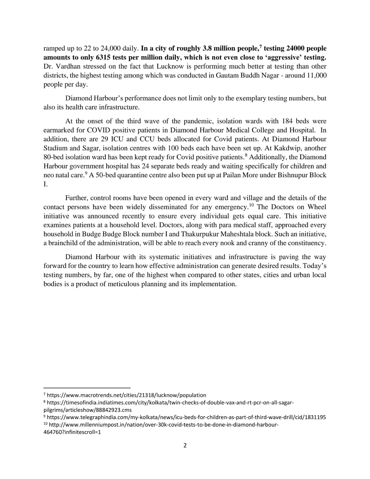এদিনের পরিসংখ্যান অনুযায়ী, ডায়মন্ড হারবারের জনসংখ্যা ২০ লক্ষ অর্থাৎ ২ মিলিয়ন। এত সংখ্যক মানুষের মধ্যে এদিন করোনা টেস্ট হয়েছে ৫৩,২০৩ জনের। অর্থাৎ প্রতি মিলিয়নের ২৭০০০ টেস্ট। সে হিসেবে দেশের অন্যতম বড় শহর মুম্বইয়ে জনসংখ্যা ২০ মিলিয়ন। এখানে দৈনিক টেস্টে সংখ্যা ৬৭০০০। অর্থাৎ প্রতি মিলিয়নে মাত্র ৩৫০০। একইরকমভাবে চেন্নাইয়ের ক্ষেত্রে মোট জনসংখ্যা ৮ মিলিয়ন, দৈনিক টেস্ট ৩০০০০। অর্থাৎ প্রতি মিলিয়নে ৩৭৫০। বিজেপি শাসিত উত্তরপ্রদেশের লখনউয়ের ছবিটাও খুব একটা ভালো নয়, ৩.৮ মিলিয়ন জনসংখ্যার লখনউয়ের দৈনিক টেস্টের সংখ্যা ২৪ হাজার। অর্থাৎ প্রতি মিলিয়নে মাত্র ৬৩১৫।